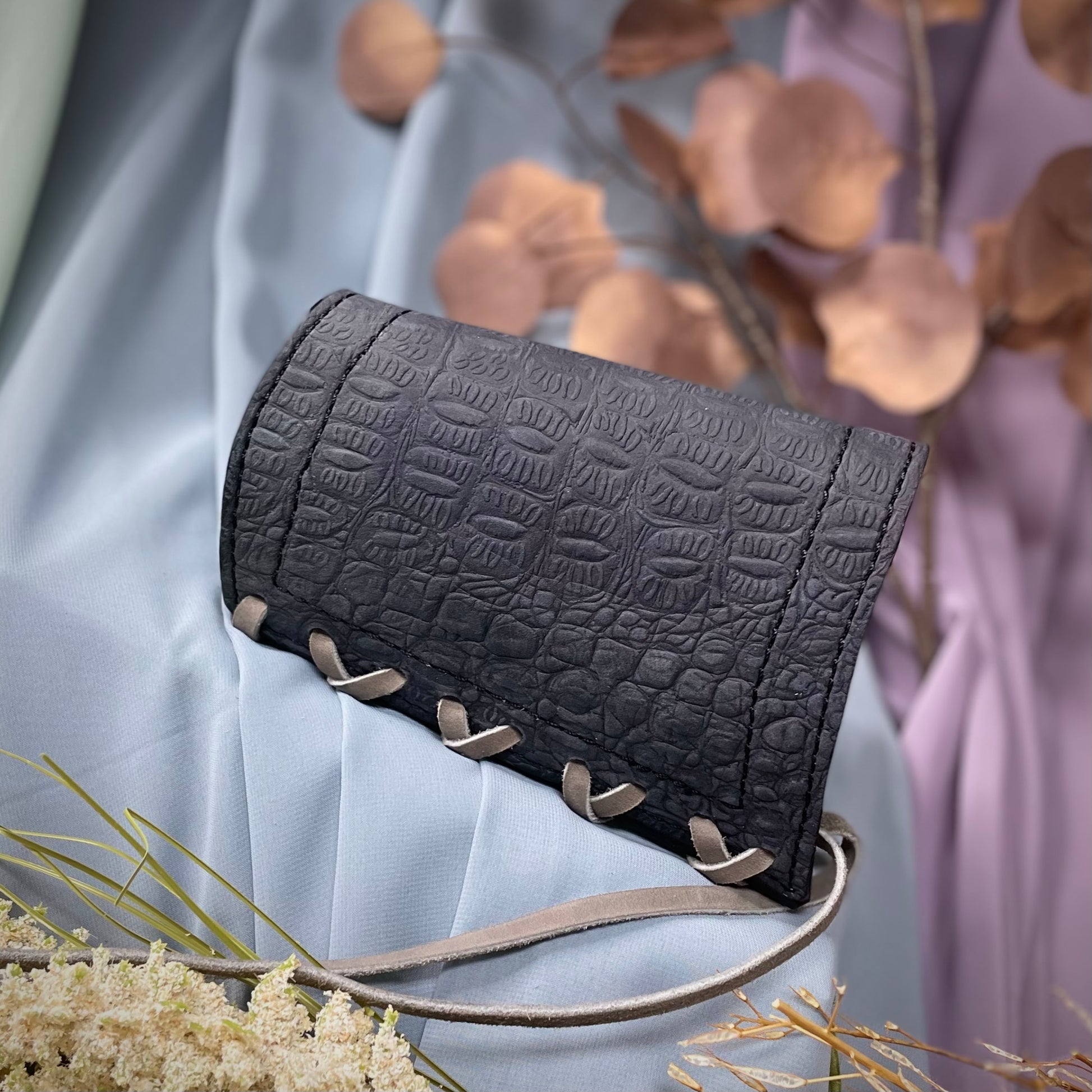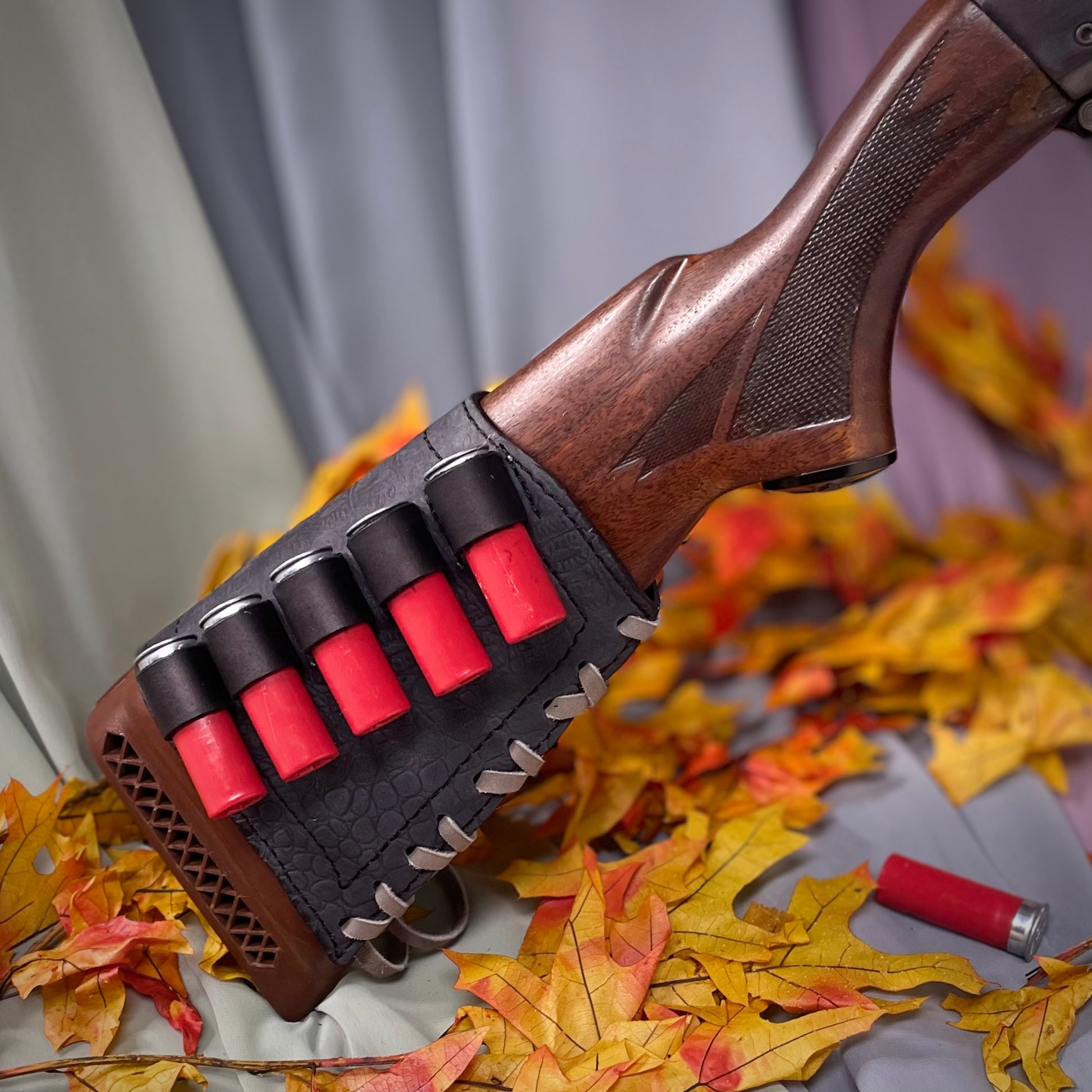 Customize your shotgun with this one-of-a-kind Stock Cover, handcrafted from premium cow hide leather in a midnight gator embossed pattern. Designed to fit tightly on your shotgun's stock, this 12 gauge cover holds up to 5 rounds without scratching. Perfect for any adventure, this cover is as unique as your story.