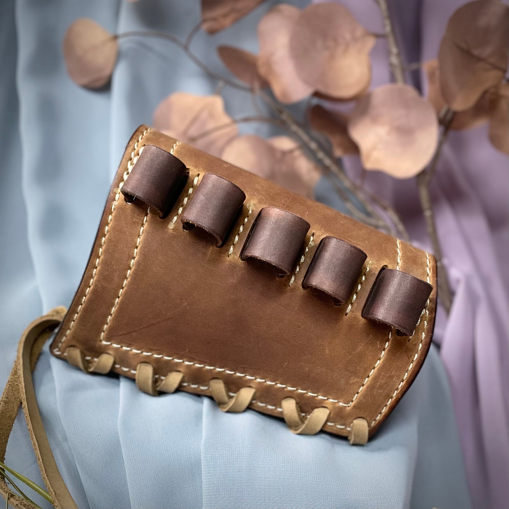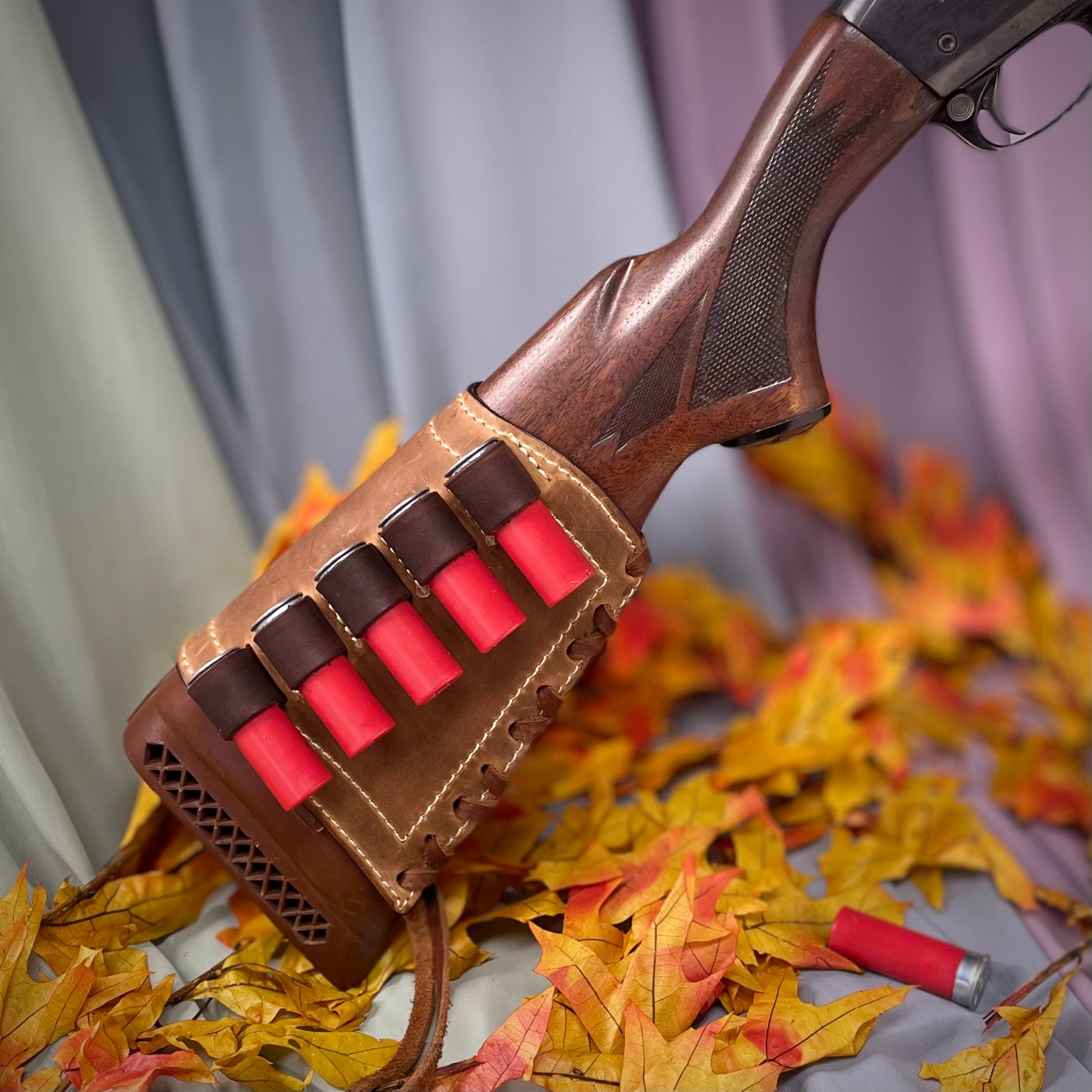 Customize your shotgun with this one-of-a-kind Stock Cover, handcrafted from premium cow hide leather in a saddle brown oil tan with a light tan pull up and beige nubuck lining. Designed to fit tightly on your shotgun's stock, this 12 gauge cover holds up to 5 rounds without scratching. Perfect for any adventure, this cover is as unique as your story.
